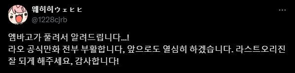 | 공식만화가 정상화 되었네요. 좋은소식 입니다. (0) | 2024.06.10 |