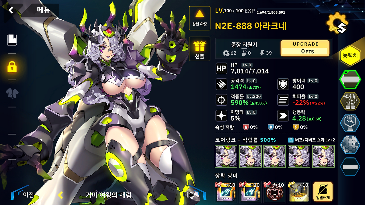 글쓰면서 보는데 아라크네는 공격지원 대상도 아니고 딜도 안나와서 아예 공격 못하게 봉인하는게 더 좋을거 같은데 평소 버릇처럼 ap세팅을 해놓았네요. 저래봤자 긴 공격모션에 시간만 더 잡아 먹었겠네요 =_=;;