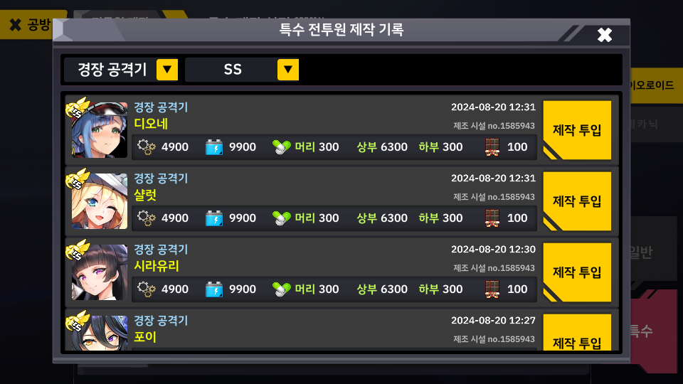 디오네 아이샤식으로 833회만에 득 ㄷㄷㄷ 먼저 이번 디오네 아이샤식은 4900 / 9900 / 6900 입니다. 모든 제조 중 가장 뽑기 어려운 SS 경장 공격기라서 긴장 많이 했는데... 역시나... 총 833회 만에 뽑았습니다. 하하하 =ㅁ=... 현재 버그로 화면이 제대로 안뜨더군요 =ㅁ=... 부품 4,081,700개전력 8,246,700개영양 5,747,700개 ... 오랜만에 기강 쎄게 잡혔습니다 ㅎㅎ;; 라스트오리진 관련 잡담 2024.08.20