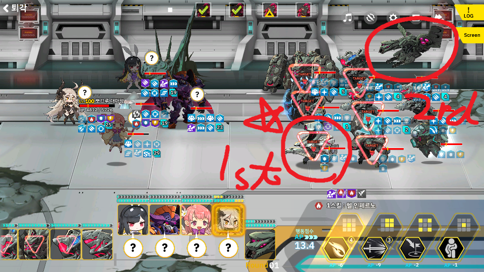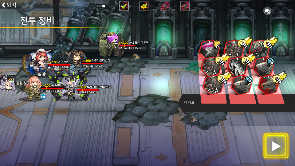 4-25는 라오의 공성병기 아머드 메이든이 보너스를 받는 맵입니다. 이 블로그의 섬넬이기도 한 블러디 팬서가 강력한 탱커 및 반격 딜러로 활약 했습니다. 이 맵의 숙제를 풀면 쉽게 클리어가 가능하지만 숙제를 푸는 과정까지 가는데 오래걸렸네요. 맵 구성이 악랄한게 보호무시가 중요한데 보호무시 공격이 광역기다 보니 또 광역기 넣으면 망하는 맵인지라 진짜 숙제 푸는데 머리 좀 굴려야 했습니다. 제 경우는 장비로 암습OS를 2개나 사용했는지라 없으면 좀 더 돌아가야 되는 불편함이 있습니다. 클리어 하는데 도움을 드린다면 중요한 포인트가 있는데 먼저 중요한건 1,2 스테이지를 진행하며 블팬을 대기 시켜 방어모드로 진행 하다가 3스테이지 직전에 아래의 스샷처럼 노말모드로 미리 해제 해야 됩니다. 왜냐하면 방어모드에..