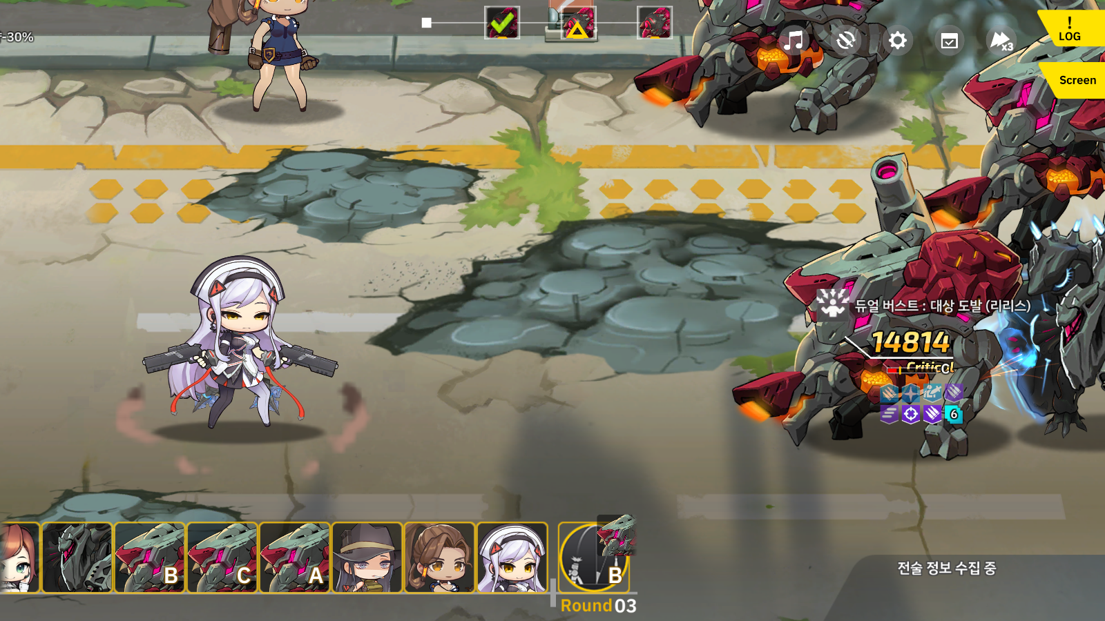 클리어 스샷에 파티원 2명이 전투 이탈했는지라 혹시나 어려운 스테이지 인가 오해하실수 있는데 그냥 날로먹는 스테이지 입니다. 그냥 걔들은 쑈하다고 죽은거고 해당맵은 그냥 리리스 혼자 클리어 하는 맵입니다. 당초 처음 스테이지 보너스 유닛을 보고 미스세이프티가 활약하겠구나 했는데 개뿔 그런거 없습니다. 적이 표식이니 이런거 들고 있어서 어그로 다팁니다. 미스세이프티는 그냥 해당 맵의 보너스를 받기 위한 용이고 그냥 리리스가 딜과 탱 다하고 원맨쇼로 합니다. 같이 데려간 딜러들은 아무것도 못하더군요 -_- 하하하;;; 다필요없고 리리스에게 받는 피해 감소 장비만 둘둘 하시면 되겠습니다. 그러면 알아서 반격하고 때려잡습니다. 그리고 칙런쳐는 대중장형 데미지 감소 스킬을 사용하기 때문에 딜러들 데미지가 아예 안..