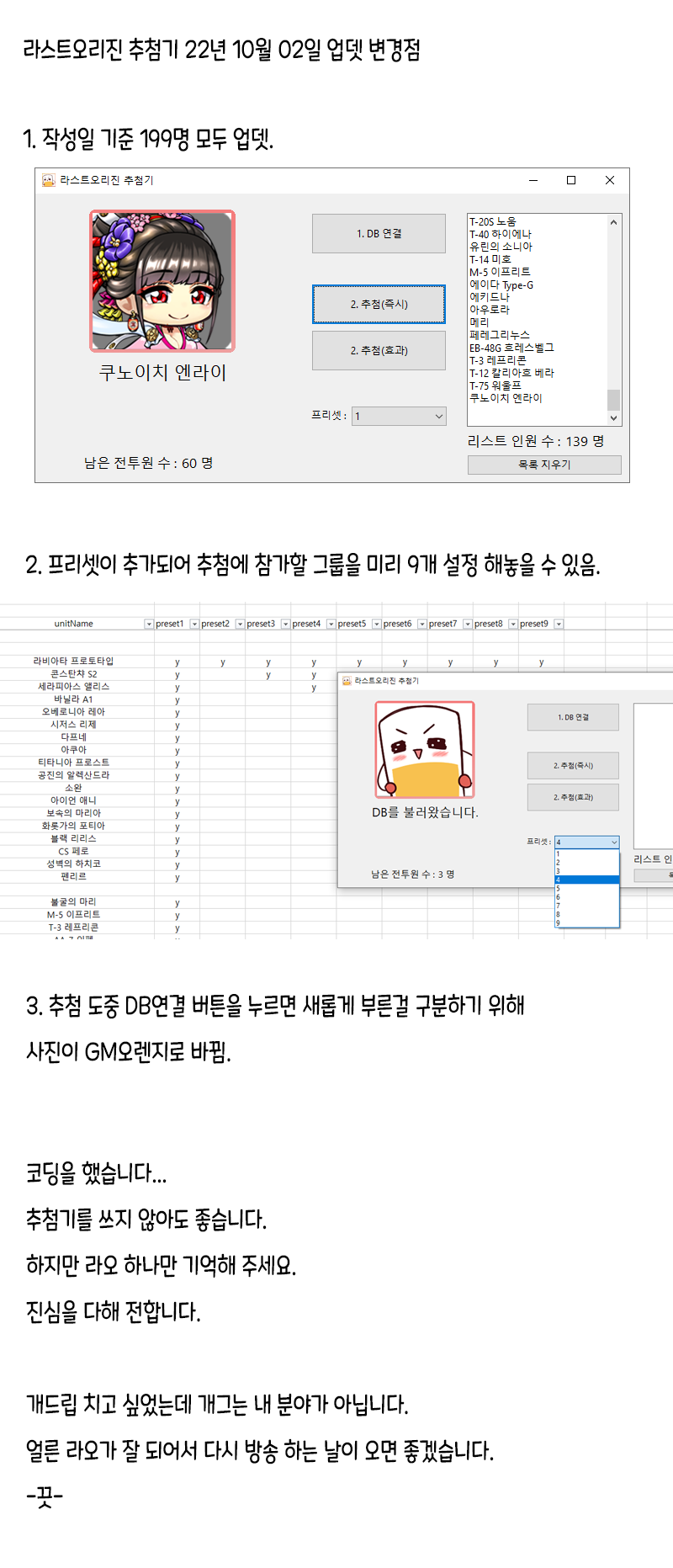 챌린지 맵들을 깨다보니 예전에 만든 스탯 비교용 프로그램에서 개선 사항이 보여서 업데이트 했습니다. 라오의 스탯 중 적중과 치명은 일정 수치가 넘어가면 낭비만 됩니다.챌린지 같은 맵은 스탯을 최대한 압축해야 되는지라 그 스탯 계산을 편하게 하기 위한 프로그램입니다. 사용방법 : 기준1과 기준2는 딱히 특정 이름을 적지는 않았지만 표준 적중인 350에 치명 100을 기준으로 디폴트로 넣어져있고 당연히 수정도 가능합니다. 기준1을 적중이라고 생각할 때 먼저 적들 중 가장 높은 회피율을 확인해서 기준값을 정해줍니다.아래의 예를 들어보면 적들 중 최대 회피율이 205%니까 기준1의 값을 305로 수정하고 아군 유닛들의 전투중 스탯을 확인해 봅니다. 레이스는 적중이 480.5로 많이 오버 되었고 치명타는 1..