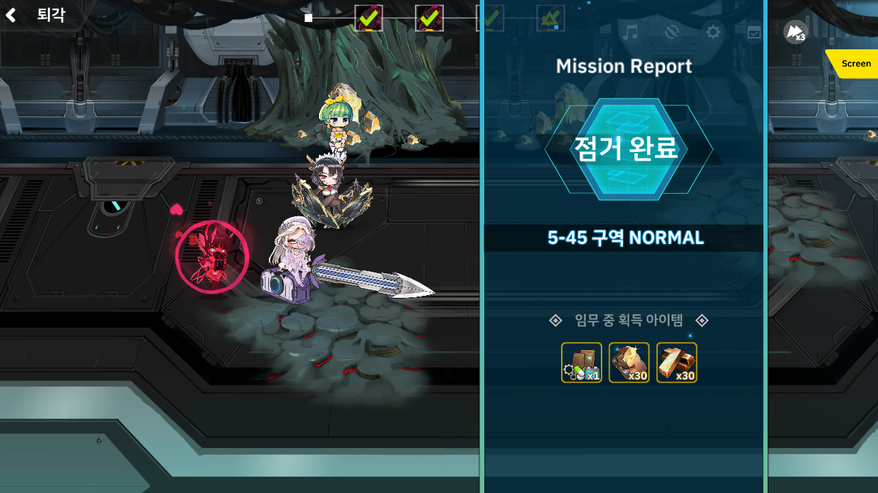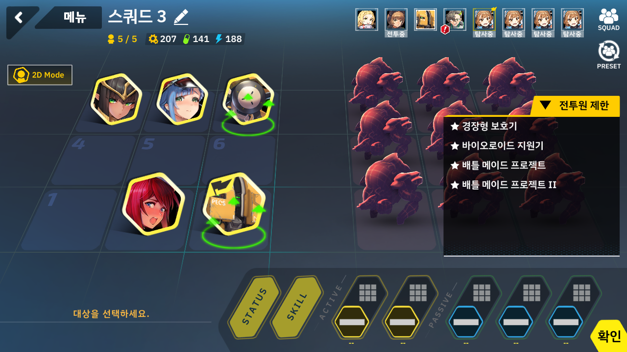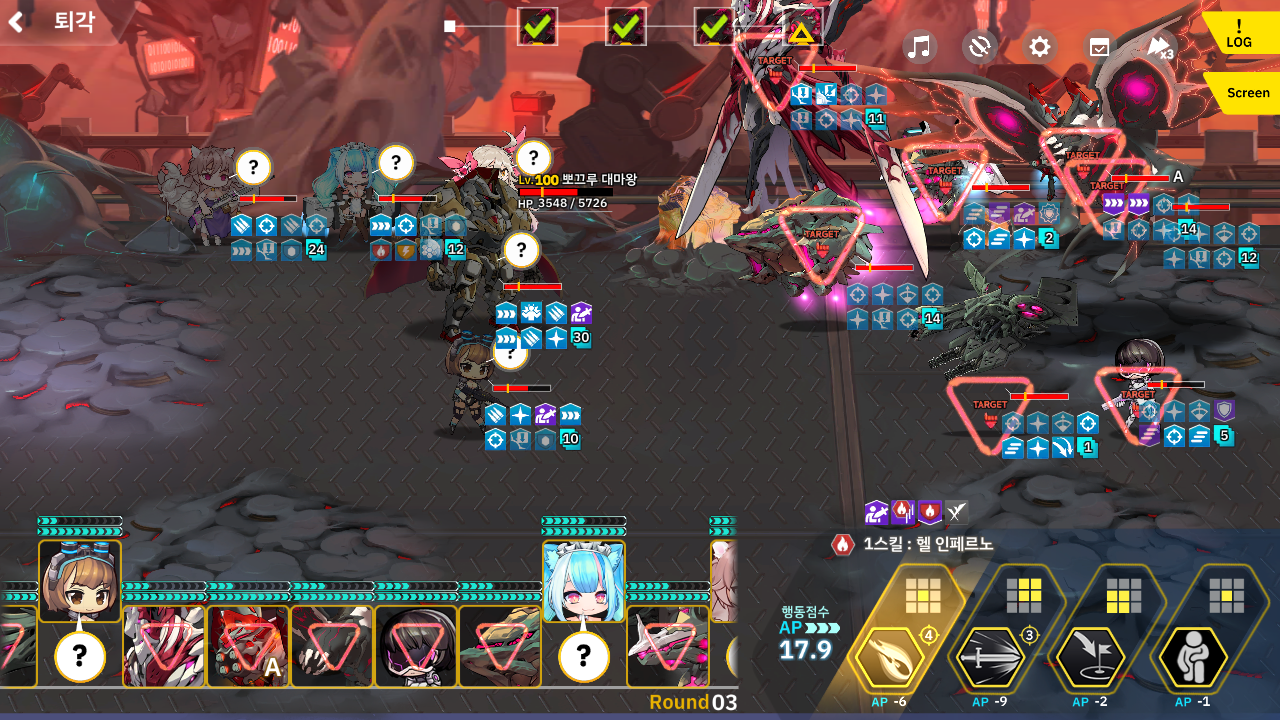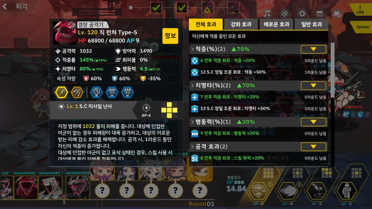 이번 적합 유닛을 보니 골든워커즈 부대 더군요. 그래서 드론, 토미 워커 덱을 꺼냈습니다. 그리고 이번에 새롭게 추가된 디오네가 도발 + 골든워커즈 시너지 길래 넣어봤는데 냉기 속성이라서 여기서는 전혀 도움이 안되더군요 하하하 -_-;; 또한 반격 버프를 달아줘도 솔직히 드론 딜을 올려도 데미지가 거의 없다는걸 깜박했습니다;; 아무튼 그래서 순전히 도발기로 짱박혀 있었고 보호 버프 거는 세크메트도 그냥 무한 대기... 결국 토미워커랑 포티아로 딜러로써 다 해먹었습니다. 아 그리고 드론의 경우 1스킬이 적의 AP를 깎기 때문에 저격병 같은 애들은 드론으로 계속 때려서 딜러가 때릴 시간이 나오게 턴 밀기를 계속 해주면 됩니다. 중장갑병 같은 반격기 가진애들은 토미워커가 기본적으로 단단하니 토미워커로 맞으면서..