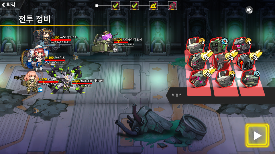 만약 암습OS가 있고 딜에 자신이 있다면 스테이지 시작하자 말자 칙 커맨더부터 바로 녹일 수 있지만 그게 아니라면 칙 커맨더가 발광모드가 되고 더불어 테스투더도 같이 발광하면 파티 전멸 합니다. 그러니 자신의 상황을 보고 칙 커맨더를 바로 끊을 자신이 없다면 미리 풀고 들어가세요.