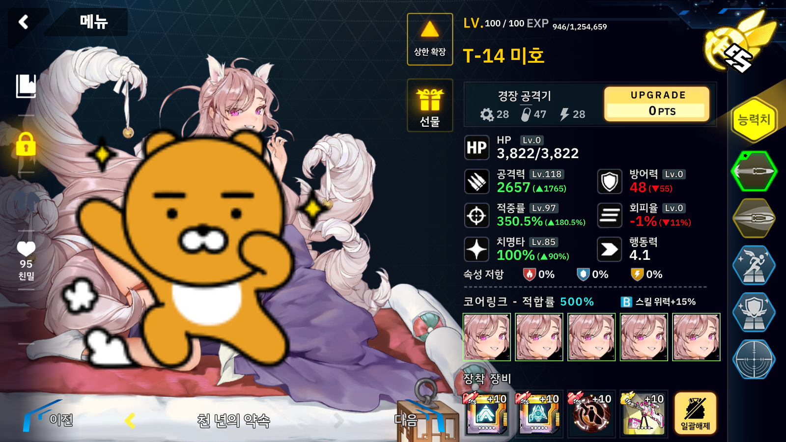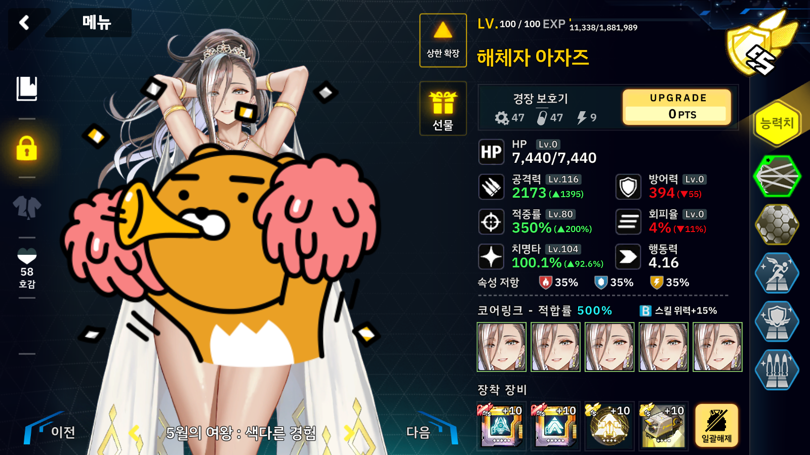 그냥 골타리온이 더욱더 쌘 반격을 해주게 아자즈를 데려갔습니다. 아자즈 대신 포츈도 있고 어차피 딱히 중요하지는 않습니다만 방캐릭이 때려야 미호가 공격지원을 해주기 때문에 보호기로 한명 데려 가야됩니다.
