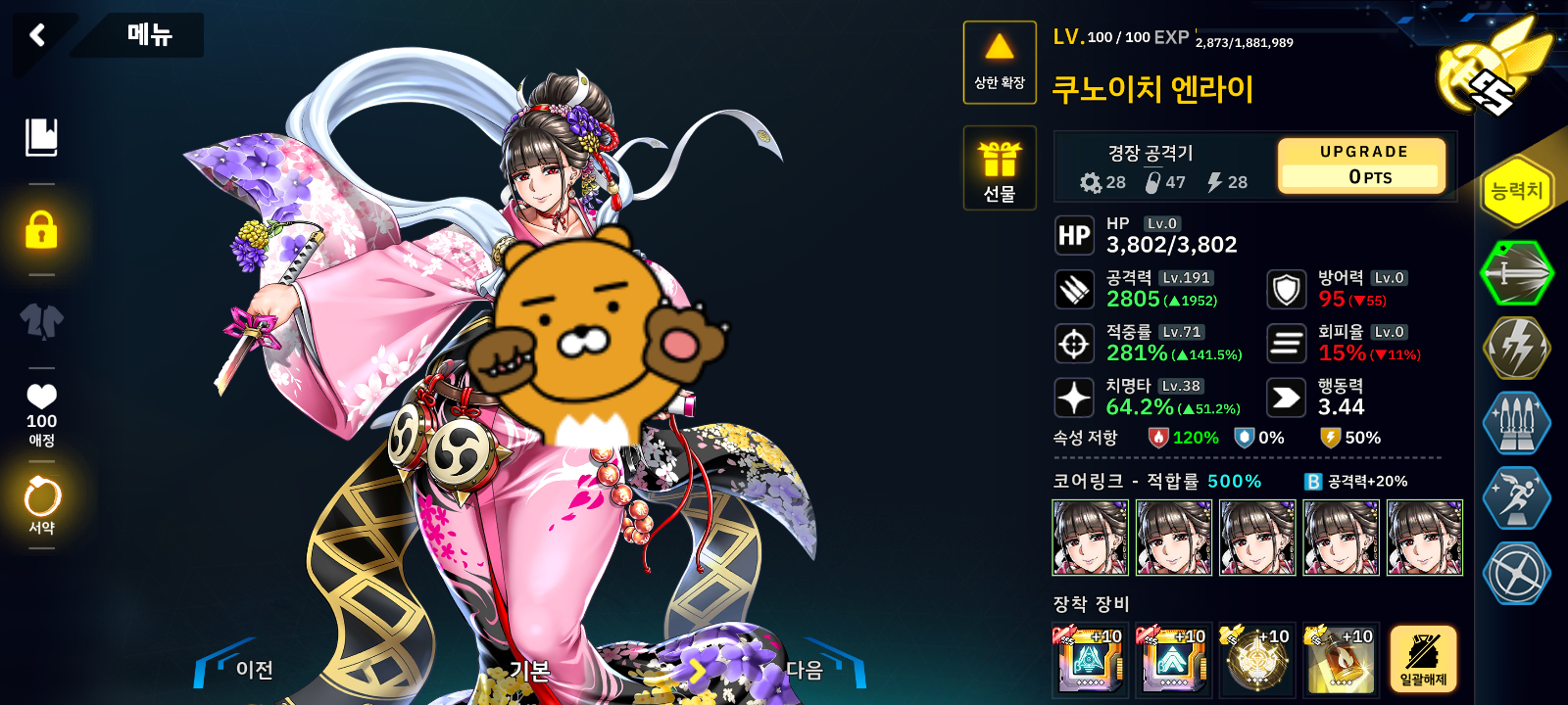 속성 딜러는 쿠노이치가 최강인지라 쿠노이치에 화염 공격 3인에 아라크네로 표식을 박아줍니다.